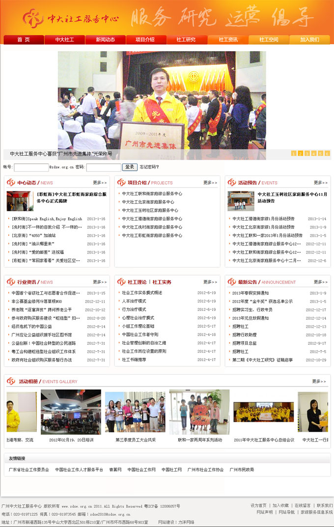 項目名稱:廣州市中大社工服務中心網站建設 簽定日期:2011年12月24日 網址:http://www.zdsw.org.cn/