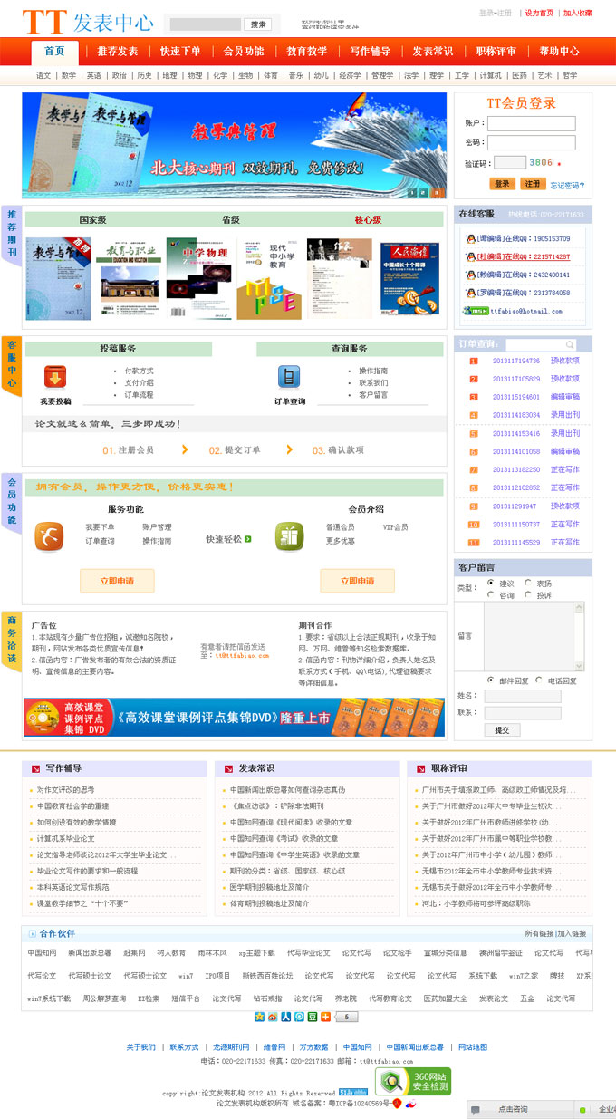 TT發表中心擁有8年專業為各類院校從事代理教育論文發表、教學論文發表的論文發表機構,以及提供相關專業咨詢服務。目前我們中心升級的TT發表中心是國內唯一實現訂單管理系統的代理發表類網站。該系統操作簡單、方便、快捷,用戶可以在幾分鐘內完成服務訂單所有操作,并可以在網上查詢服務訂單的進度。