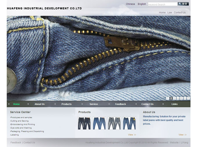 項(xiàng)目名稱:Huafeng Industrial Development Co.,Ltd網(wǎng)站制作 簽定日期:2012年6月13日 網(wǎng)址:http://www.choicejeans.com/
