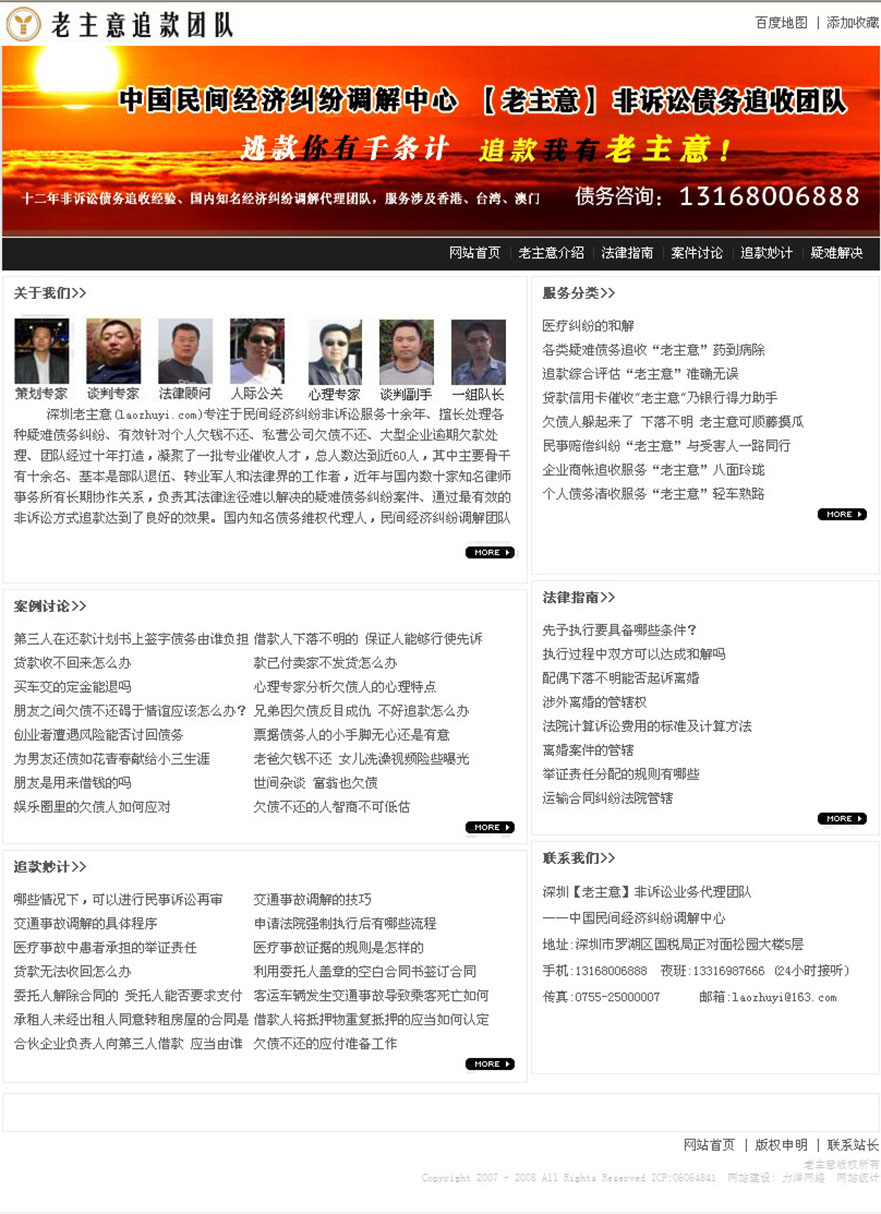 深圳老主意專注于民間經(jīng)濟(jì)糾紛非訴訟服務(wù)十余年、擅長處理各種疑難債務(wù)糾紛、有效針對個人、私營公司、大型企業(yè)債權(quán)債務(wù)處理、團(tuán)隊(duì)經(jīng)過十年打造,凝聚了一批專業(yè)催收人才,總?cè)藬?shù)達(dá)到近60人,其中主要骨干有十余名、基本是部隊(duì)退伍、轉(zhuǎn)業(yè)軍人和法律界的工作者,近年與國內(nèi)數(shù)十家知名律師事務(wù)所有長期協(xié)作關(guān)系,負(fù)責(zé)其法律途徑難以解決的疑難債務(wù)糾紛案件、通過最有效的非訴訟方式追款達(dá)到了良好的效u。