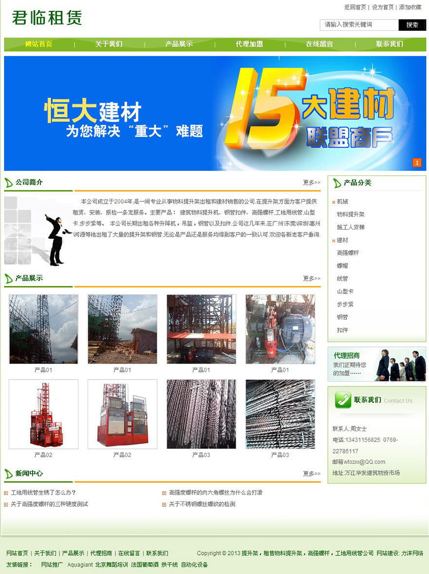 本公司成立于2004年,是一間專業從事物料提升架出租和建材銷售的公司,在提升架方面為客戶提供租賃、安裝、報檢一條龍服 。主要產品: 建筑物料提升機、鋼管扣件、高強螺桿,線管,山型卡,步步緊等。 本公司長期出租各種升降機,吊籃,鋼管以及扣件,公司這幾年來,在廣州東莞深圳惠州河源等地出租了大量的提升架和鋼管,無論是產品還是服務均得到客戶的一致認可,歡迎各新老客戶垂詢.