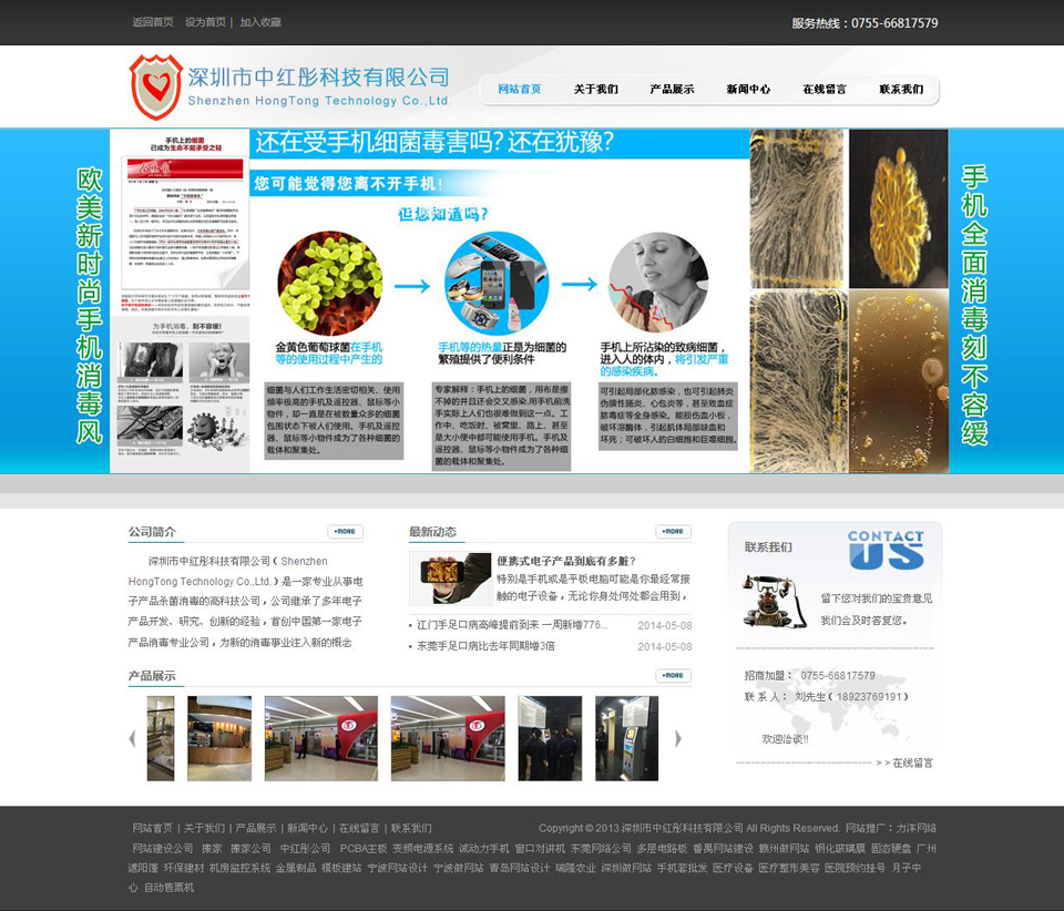 深圳市中紅彤科技有限公司(ShenzhenHongTongTechnologyCo.,Ltd.)是中國第一家專業(yè)從事便攜式電子產(chǎn)品殺菌消毒的高科技公司,公司繼承了多年電子產(chǎn)品和設備開發(fā)、研究、創(chuàng)新的經(jīng)驗,首創(chuàng)中國第一家便攜式電子產(chǎn)品殺菌消毒專業(yè)公司,并擁有相關多項專利,為新的消毒殺菌事業(yè)注入新的概念,成為這一新興行業(yè)的領航人。