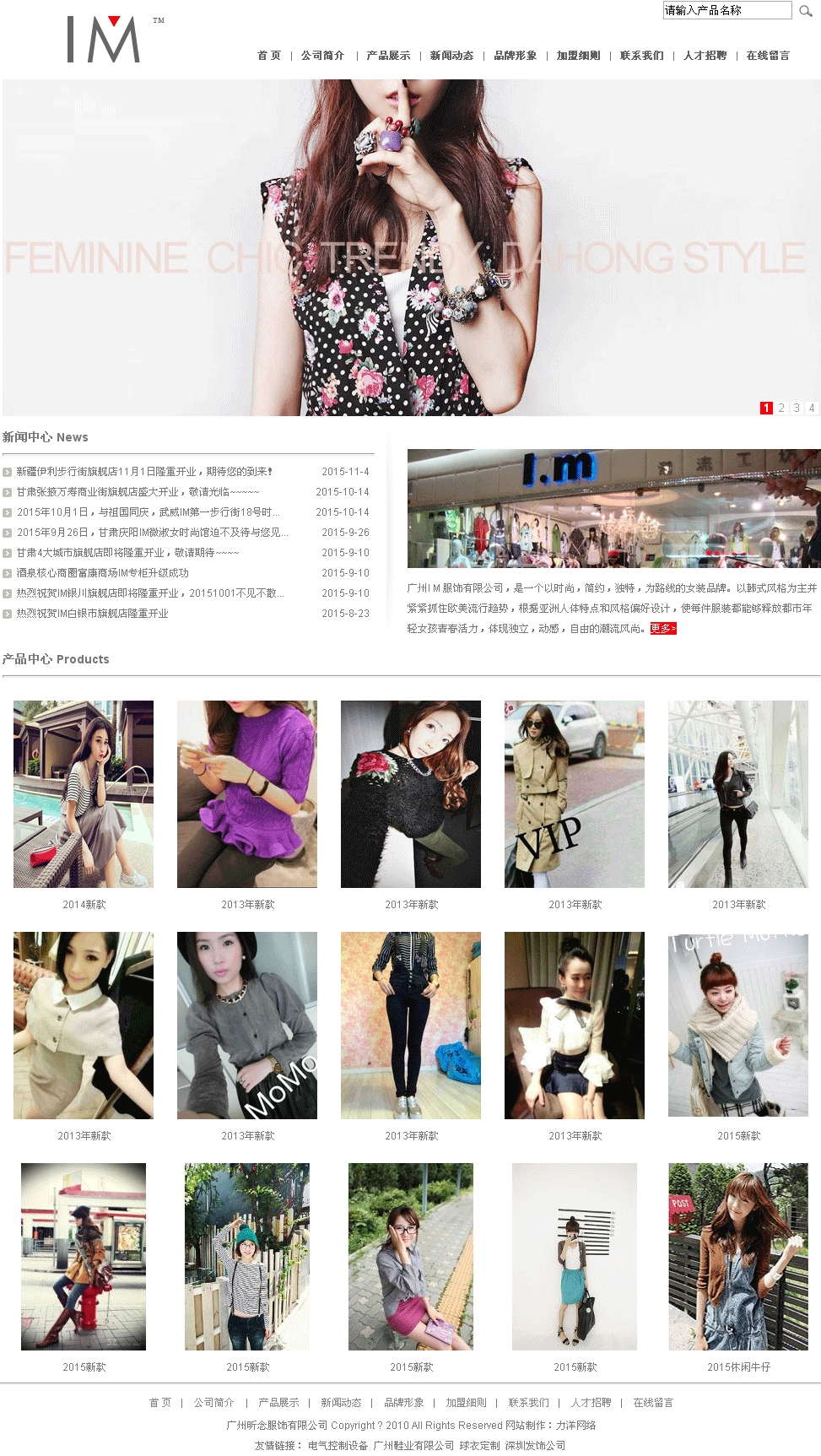 廣州I M服飾有限公司自2001年誕生以來,已經在北京,上海,甘肅,青海,寧夏,新疆,四川等地創辦了多家實體店面。 I M服飾自誕生以來一直以“產品最新客戶至上”的原則努力經營。我們一直堅持以最時尚的產品,最快的更新速度服務客戶。使我們每一個經銷商的投資風險降到最低! 網站設計預覽: