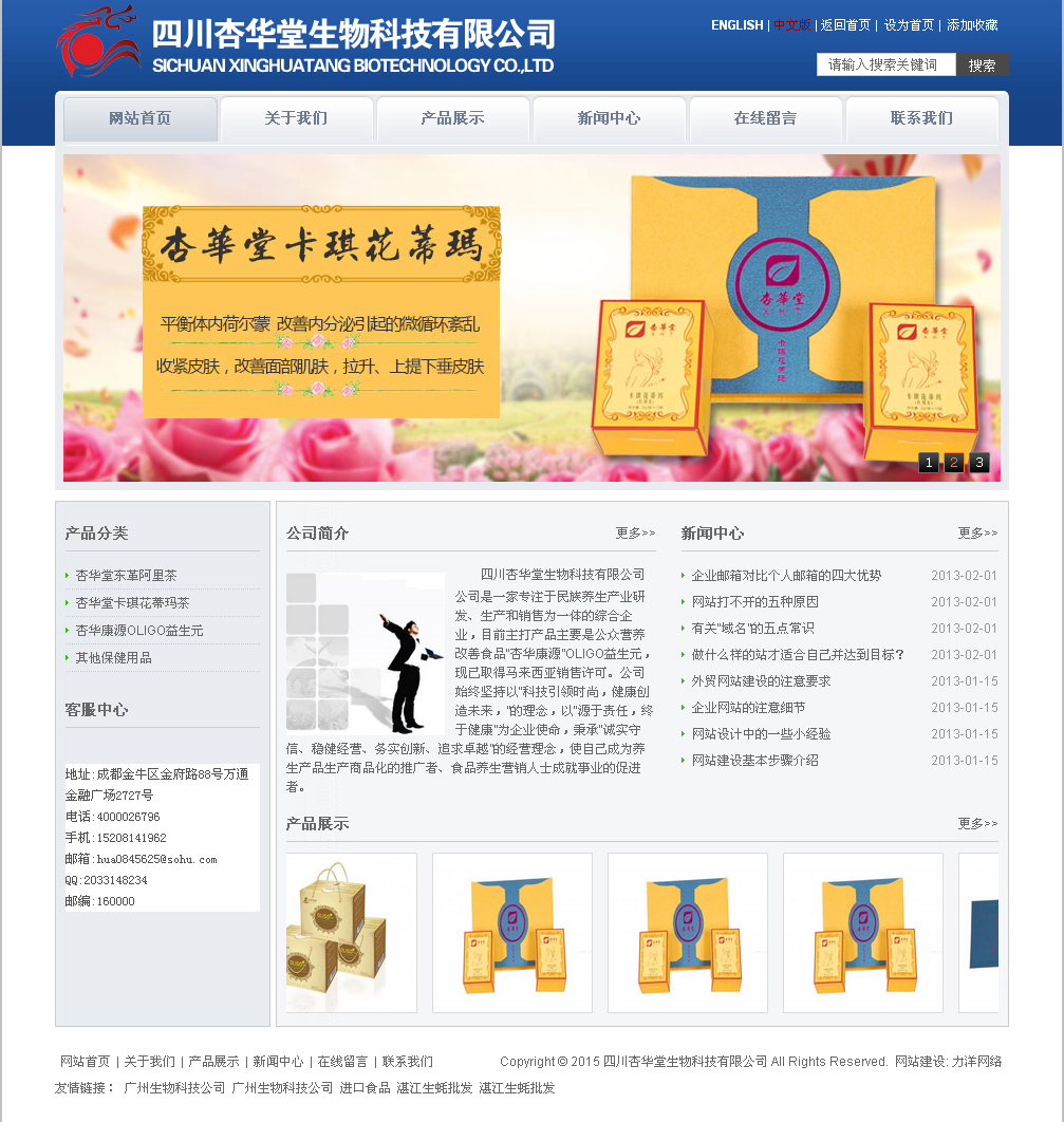 四川杏華堂生物科技有限公司始終堅持以“科技引領時尚,健康創造/來,”的理念,以“源于責任,終于健康”為企業使命,秉承“誠實守信、穩健經營、務實創新、追求卓越”的經營理念,使自己成為養生產品生產商品化的推廣者、食品養生營銷人士成就事業的促進者。 網站設計預覽: