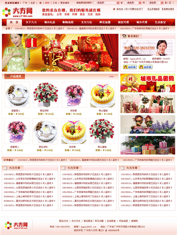 ??? 《六方網》是一家以本地服務、本地配送為親友送禮的大型網上商城,以城市鮮花蛋糕配送、城市生活用品速遞、城市名品特賣及六方精品專賣為主要經營業務。涵蓋一般禮節性的交往送禮和親人間的實質生活關懷,為您的親友提供包括鮮花、蛋糕、保健品、名煙、名酒、茶葉、及各地特產等在內的各類精美商品。《六方網》在您親友的所在地都建有服務中心服務中心組織當地優秀生活用品供貨商、配送商為您的親友提供優質高效的本地化配送服務。您的親友在哪,我們的服務就在哪。?每個人的世界都是由六度親情向外延伸。