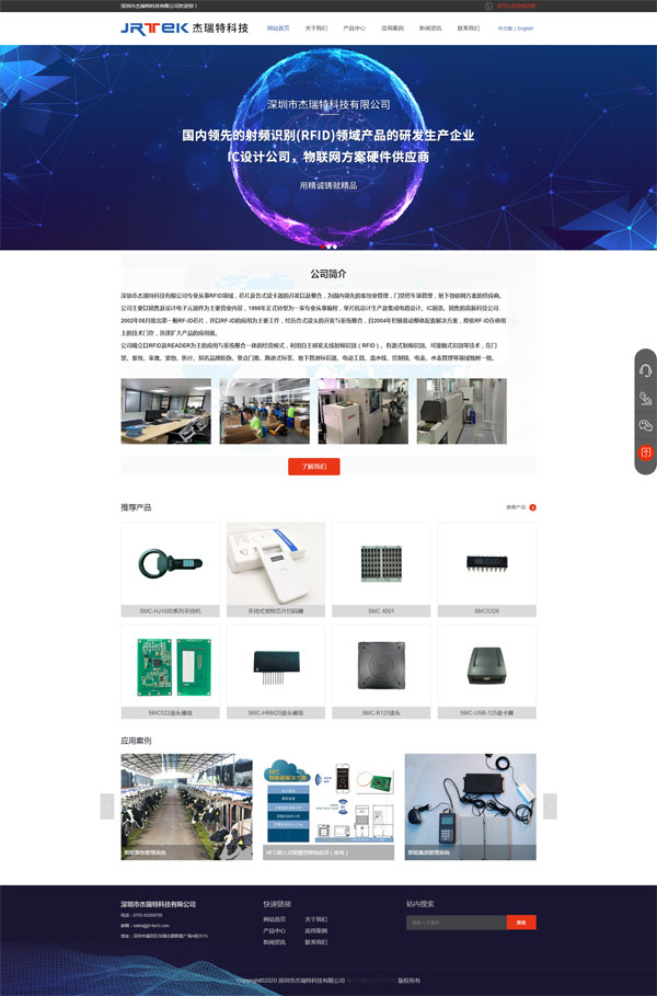 深圳市杰瑞特科技有限公司專業從事RFID領域,芯片及各式讀卡器的開發以及整合,為國內領先的畜牧業管理,門禁停車場管理,地下物聯網方案的供應商。公司主要以銷售及設計電子元器件為主要營業內容,1998年正式轉型為一家專業從事編程,單片機設計生產及集成電路設計、IC制造、銷售的高新科技公司. 2002年08月推出第一顆RF-ID芯片,并以RF-ID的應用為主要工作,經歷各式讀頭的開發與系統整合,自2004年起積極推動整體配套解決方案,降低RF-ID在使用上的技術門坎,迅速擴大產品的應用面。