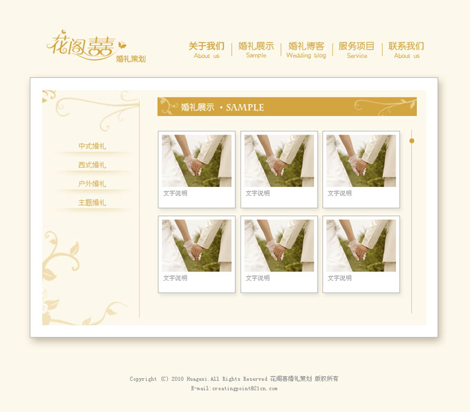 項(xiàng)目名稱:花閣喜婚禮策劃有限公司網(wǎng)站建設(shè)簽定日期:2010年9月15日網(wǎng)站首頁設(shè)計稿:...