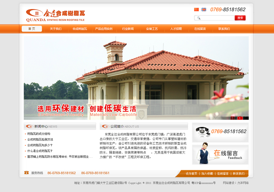 ??? 東莞全達合成樹脂有限公司位于東莞虎門鎮,廣深高速虎門出口旁的大寧工業區,交通非常便捷,公司專門從事塑料建材的研制與生產,由公司引進先進的設備和工藝技術研制的新型合成樹脂環保瓦。該產品具有隔熱保溫、材質堅韌、抗風防震、抗污防水、隔音絕緣、安裝簡便等特點,尤其適用于我國目前大力推廣的“平改坡”工程及環保工程。