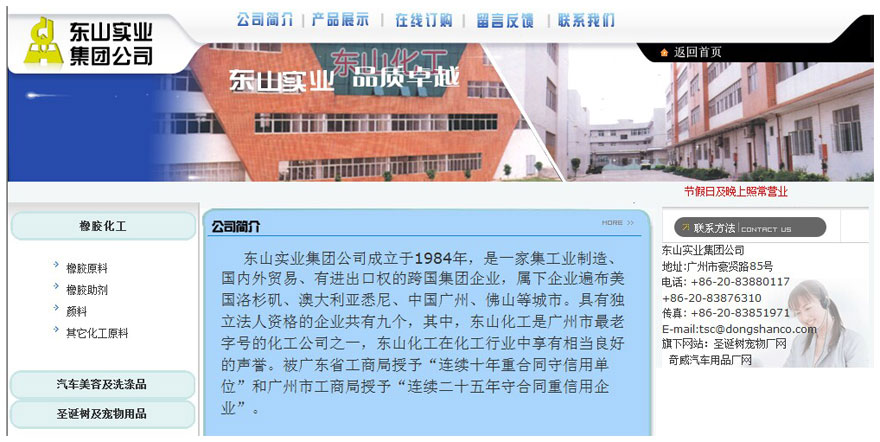 東山實(shí)業(yè)集團(tuán)公司成立于1984年,是一家集工業(yè)制造、國內(nèi)外貿(mào)易、有進(jìn)出口權(quán)的跨國集團(tuán)企業(yè),屬下企業(yè)遍布美國洛杉磯、澳大利亞悉尼、中國廣州、佛山等城市。具有獨(dú)立法人資格的企業(yè)共有九個,其中,東山化工是廣州市最老字號的化工公司之一,東山化工在化工行業(yè)中享有相當(dāng)良好的聲譽(yù)。被廣東省8商局授予“連續(xù)十年重合同守信用單位”和廣州市工商局授予“連續(xù)二十五年守合同重信用企業(yè)”。