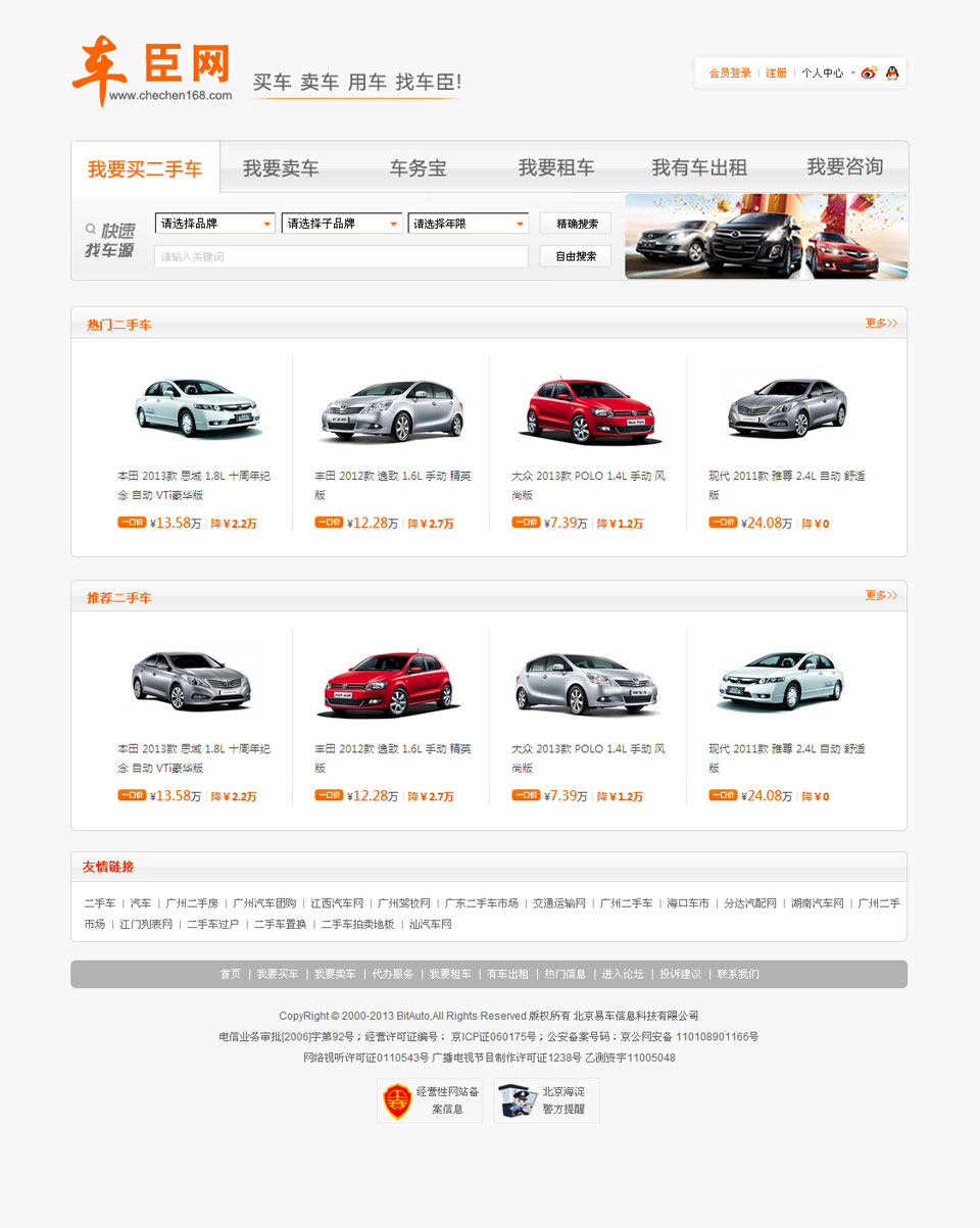 項目名稱:車巨網網站設計 簽定日期:2013-8-12 項目網址:www.chechen168.com 網站簡介: 車巨網以“不賺差價”的商業定位,配套“車務寶”專業二手車檢測系統,開創并領導中國二手車經紀模式。 車巨網融合網站、線下連鎖店和全國客服中心,構建了完整的、覆蓋全國的“三網合一”服務體系,是國內一流的二手車交易平臺。 網站首頁設計縮略圖:
