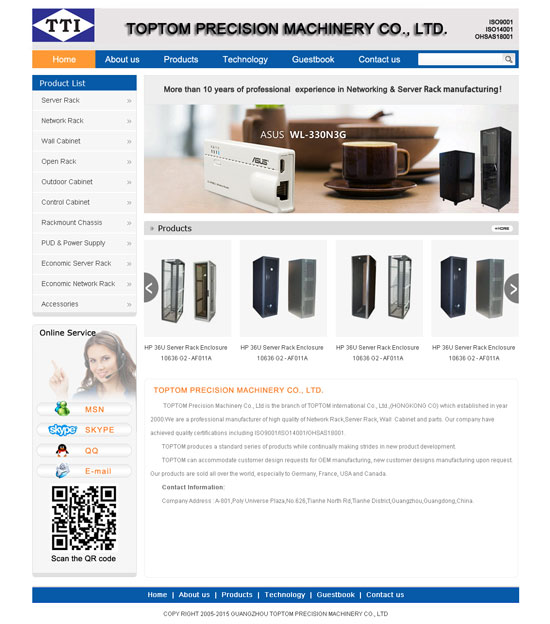 TOPTOM Precision Machinery Co., Ltd is the branch of TOPTOM international Co., Ltd.,(HONGKONG CO) which established in year 2000.We are a professional manufacturer of high quality of Network Rack,Server Rack, Wall Cabinet and parts. Our company have achieved quality certifications including ISO9001/ISO14001/OHSAS18001. TOPTOM produces a standard series of products while continually making strides in new product development. TOPTOM can accommodate customer design requests for OEM manufacturing, new customer designs manufacturing upon request. Our products are sold all over the world, especially to Germany, France, USA and Canada.