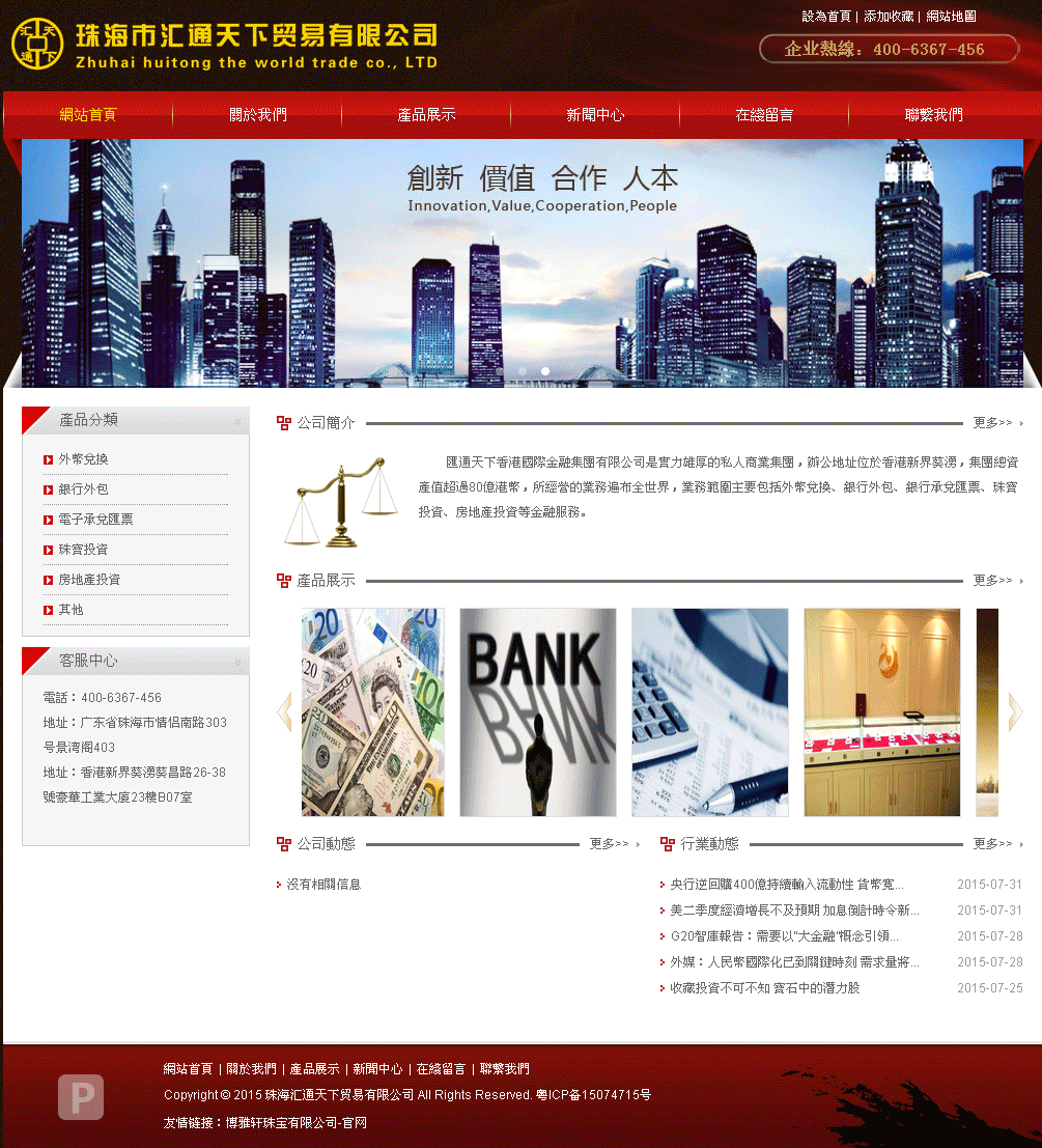 項目名稱:珠海市匯通天下集團 簽定時間:2015-7-28 項目網址:http://www.httxjt.cn 網站簡介: 珠海匯通天下貿易有限公司在瞬息萬變的金融市場能為客戶提供有效的金融市場解決方案,根據國內外客戶的不同需求,在深入分析行業和市場的基礎上,為客戶設計各種高質量的金融產品和有效的實施方案助客戶借助我公司這壹鏈接國內和國際金融市場的橋梁,實現經濟發展新目標。 網站設計預覽: