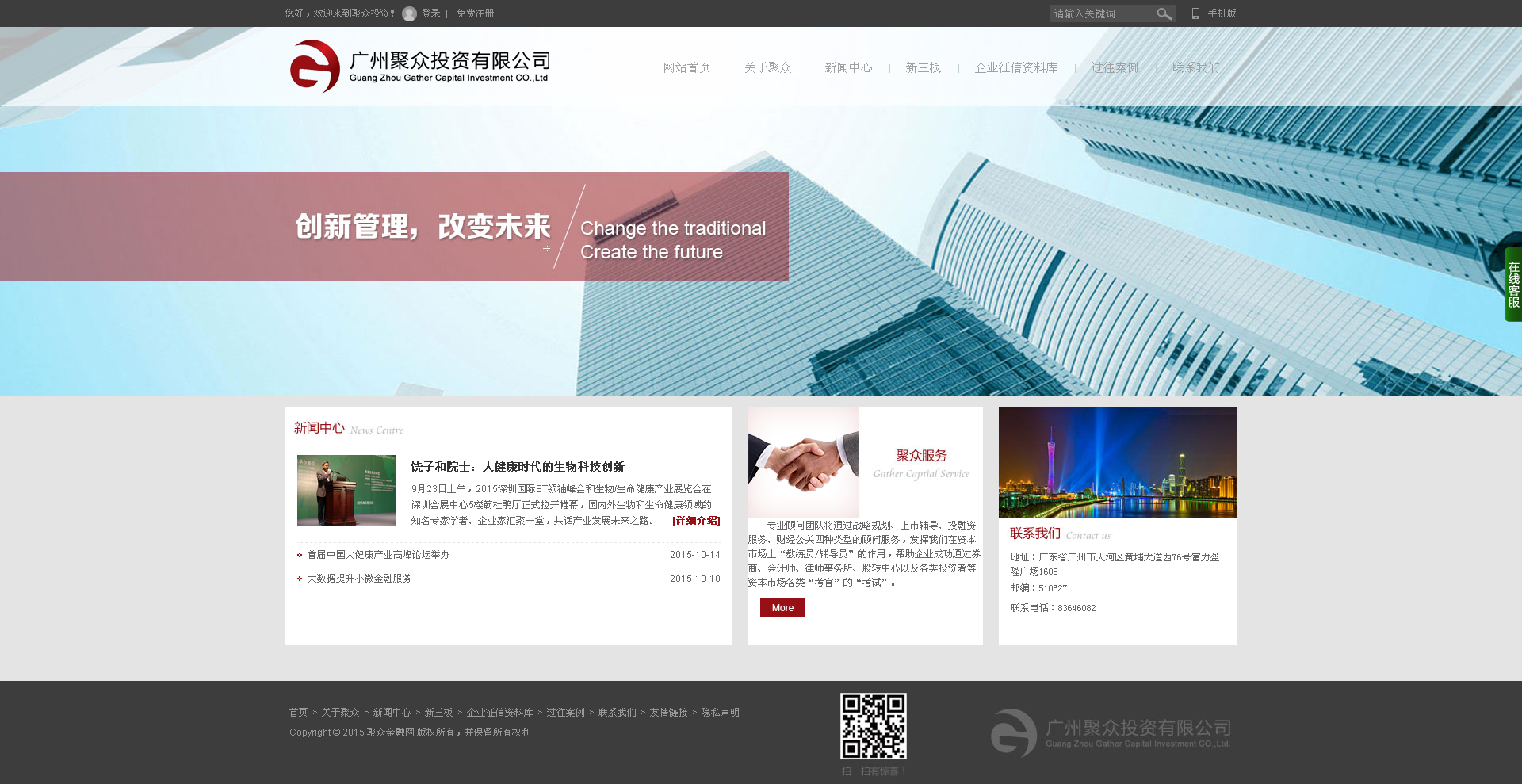 項目名稱:廣州聚眾投資有限公司網站建設 簽定時間:2015-9-11 項目網址:http://www.gcoo8.com 網站簡介: