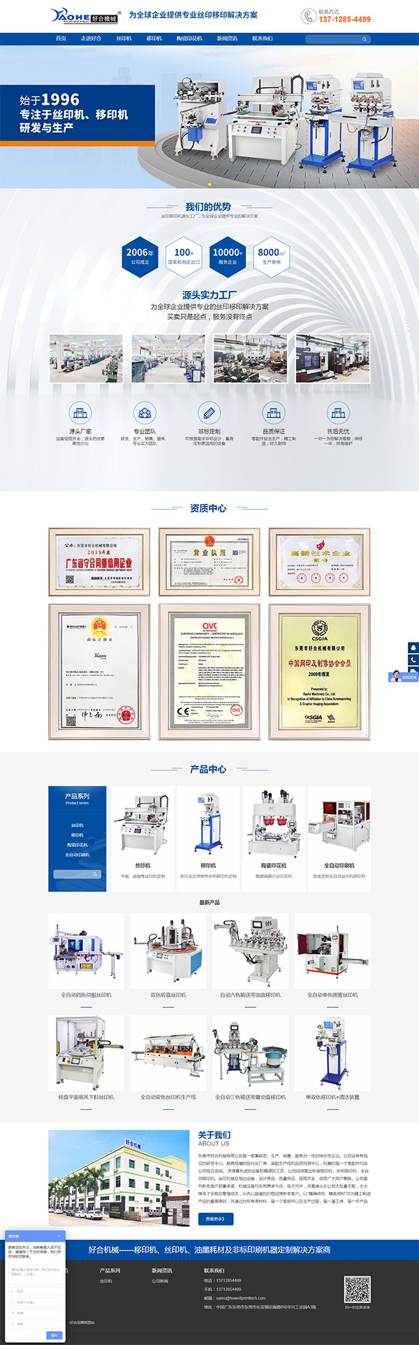 東莞市好合機械有限公司是一家集研發(fā)、生產(chǎn)、銷售、服務為一體的綜合性企業(yè)。公司設有有獨立的研發(fā)中心、頗具規(guī)模的現(xiàn)代化廠房、裝配生產(chǎn)線和品質(zhì)檢測中心,機器的每一個零配件均由公司獨立完成。 憑借著先進的設備和精湛的工藝,公司陸續(xù)推出標準移印機、非標移印機、全自動移印機、絲印機械及周邊設備,設計美觀、質(zhì)量保證、規(guī)格齊全,倍受廣大用戶青睞。公司面向新老客戶鄭重承諾,機械設備均采用原裝氣動、電子元件,并直接從總公司大批量采購,大大降低了采購及管理成本,從而以超值的價格回饋新老客戶。以"精確結(jié)構(gòu)、精良用材"作為精工制造產(chǎn)品的最高原則,并通過對所有原材料、每一個零部件以及生產(chǎn)過程,每一道工序、每一件產(chǎn)品的嚴格把關來保證產(chǎn)品質(zhì)量要求以及配套能力,使我們合作的每一個客戶真正得到"省心、省事、省錢。" 公司一貫遵循"質(zhì)量第一、顧客至上"的宗旨,以"誠""信"為行業(yè)準則,為用戶提供優(yōu)質(zhì)的產(chǎn)品、優(yōu)良的服務.